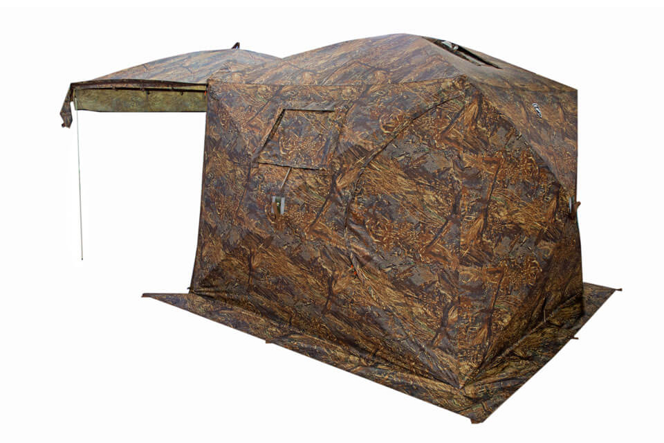 - Для комфортного использования палатки в теплое время года, конструкцией предусмотрена откидная стенка, которая устанавливается на стойки (в базовом комплекте), образуя навес. При желании, навес может быть дополнительно оборудован съемной москитной верандой по всему периметру откидной стенки.