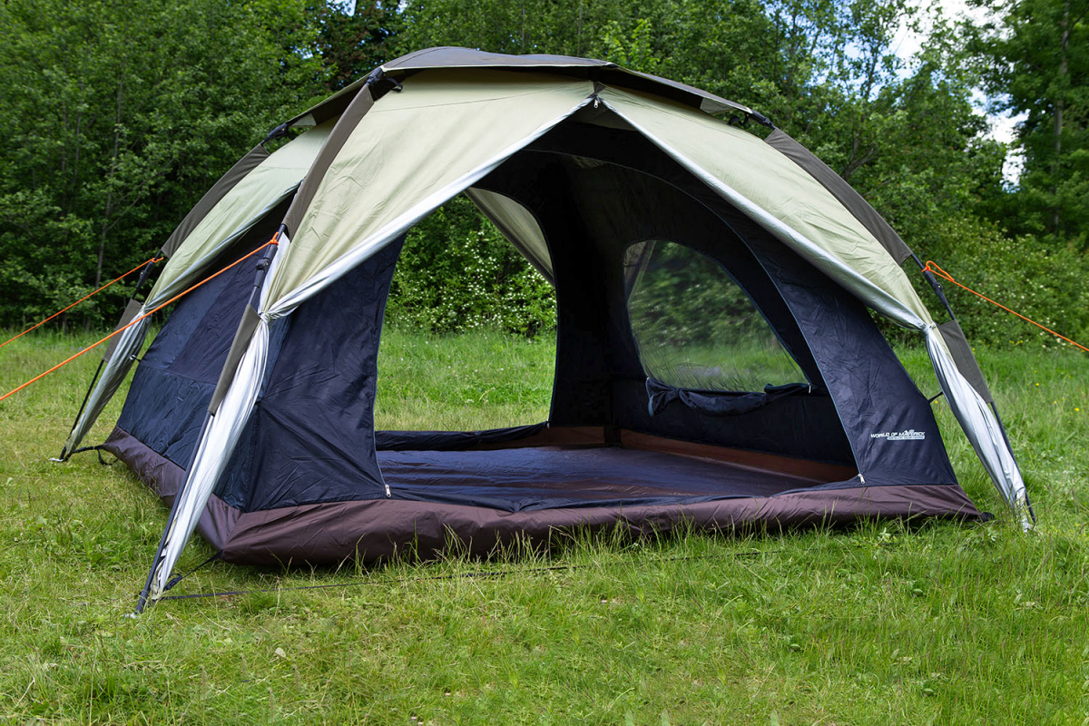 Палатка Монблан идеально подходит для выездов на природу или рыбалку с ночевкой. Благодаря быстросборному каркасу Rapidex Quick Erect System, время установки палатки составляет всего лишь 30 секунд. При этом внутренняя палатка уже пристегнута к тенту. Внутри свободно разместятся три взрослых человека и вещи. Палатка имеет два входа и один тамбур. Эта модель уникальна в своем роде.