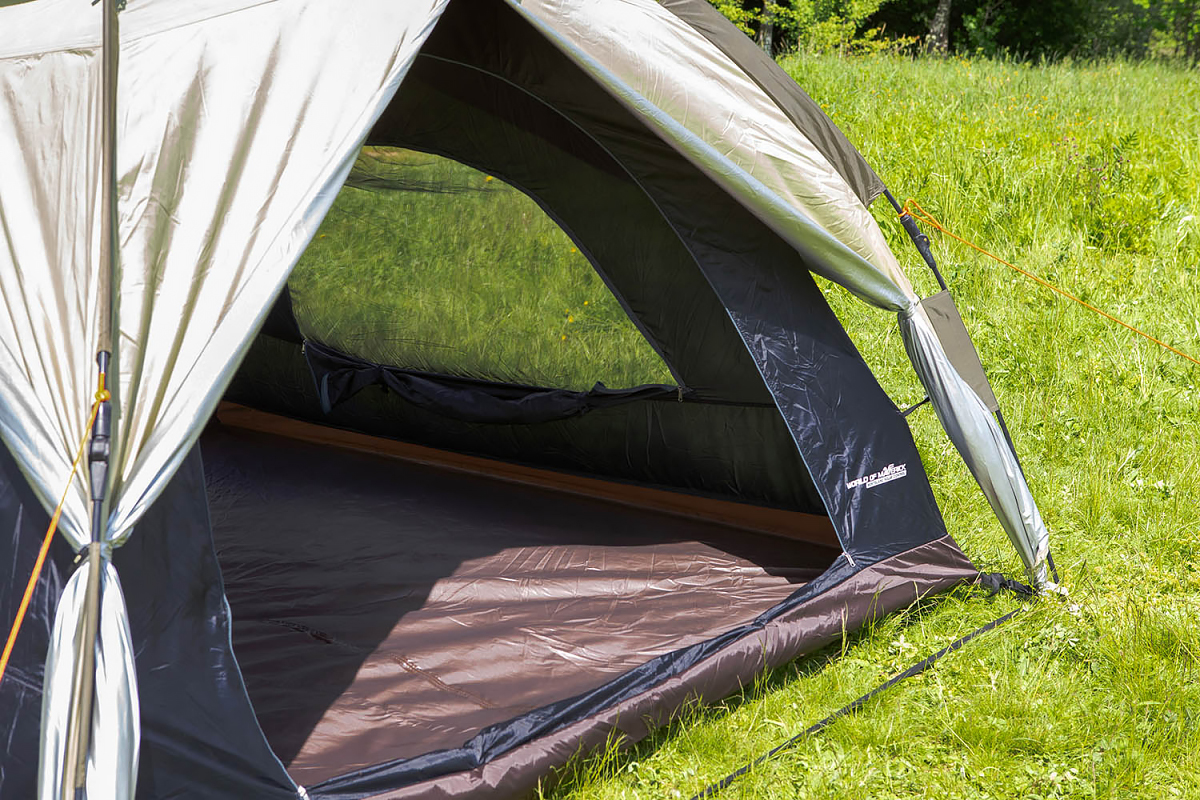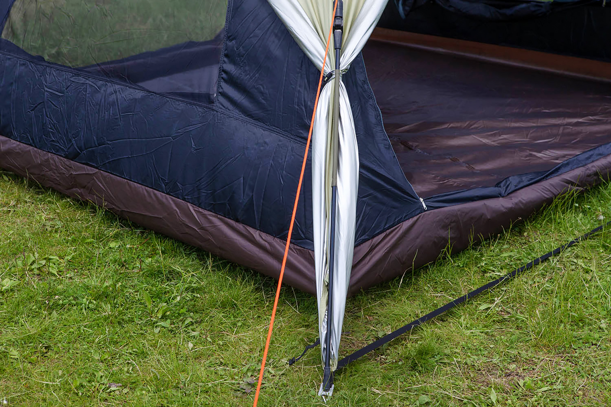 - Кроме двух входов на боковых стенках внутренней палатки расположены два больших окна, защищенных противомоскитной сеткой. На боковых стенках тента во всю длину от крыши до земли есть вертикальные застежки «молнии». Если на улице сильная жара, а вы решили подремать, вам достаточно открыть оба входа и расстегнуть молнии на боковых стенках. Палатка становится полностью проветриваемой. Размер тамбура позволяет разместить внутри не только обувь, но и некрупные вещи. Оба входа внутренней палатки и окна дублируются противомоскитной сеткой и ветро/водозащитными шторками.