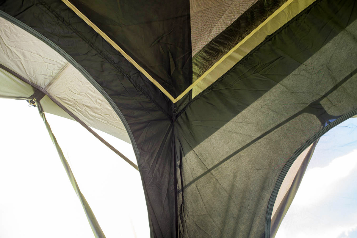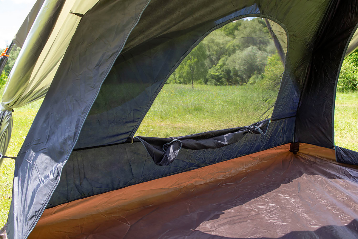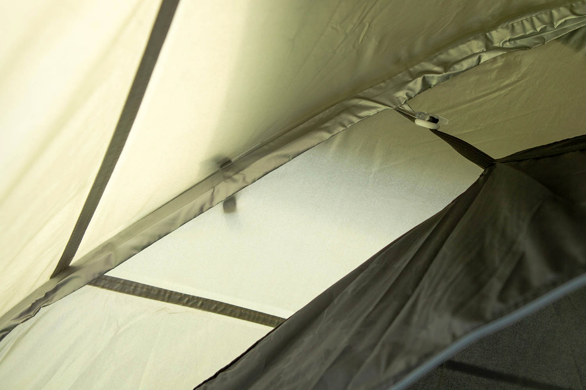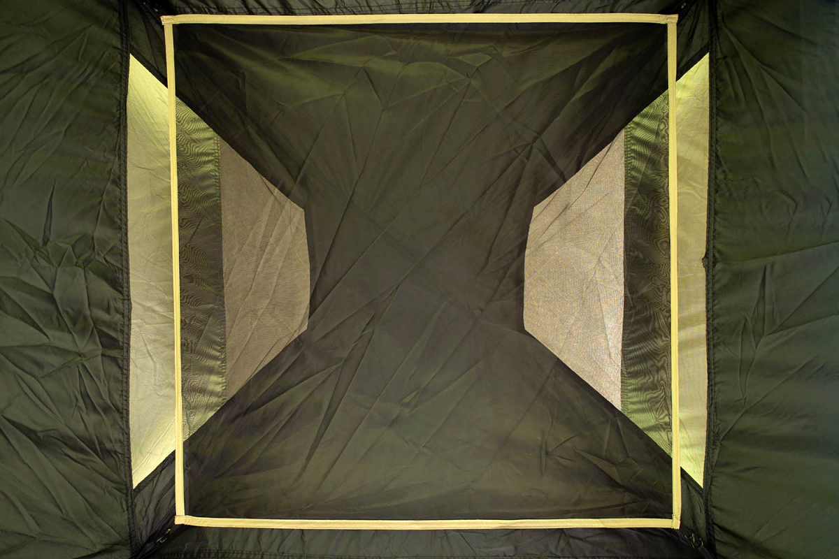 - На боковых стенках внутренней палатки располагаются сетчатые кармашки для мелких предметов. Кроме того, под куполом внутренней палатки крепится полочка из сетки, на которую можно положить, к примеру, очки, фонарик, документы и т.д. Для большего улучшения вентиляции в куполе тента имеются два треугольных отверстия с противомоскитной сеткой. Сверху вентиляционных отверстий - защитный фартук, предотвращающий попадание воды через эти отверстия во время дождя.