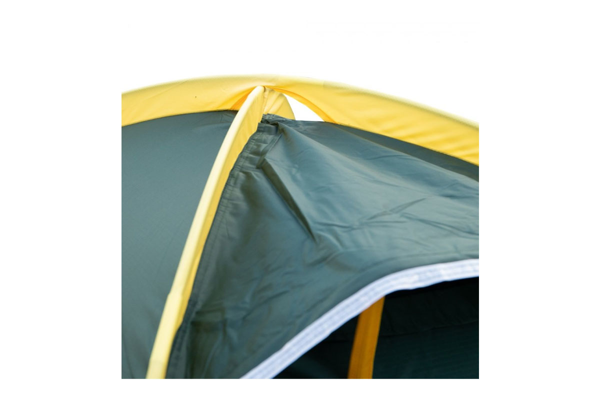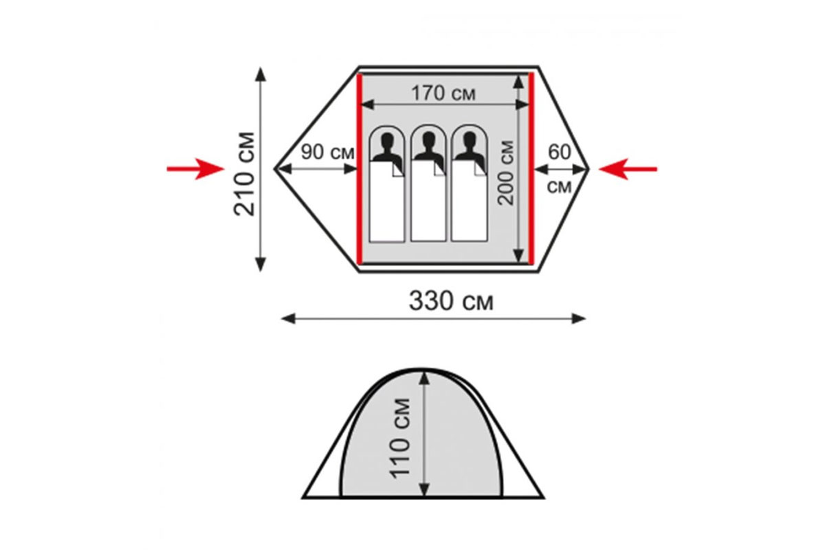 Трехместная палатка с внешним каркасом. Предназначена для несложных походов, рыбалки и выездов на природу. Вес составляет 3,8 кг. Конструкция включает два входа. Вентиляционные окна способствуют циркуляции воздуха. Имеется два тамбура разного размера.