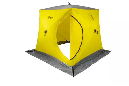 Зимняя палатка для рыбалки кубической формы. Конструкция предназначена для защиты от ветра и осадков. Установка выполняется одним человеком. Каркасная система переводится из транспортного положения в рабочее. Стенки палатки имеют выпуклую форму. Внутреннее пространство оснащено вентиляционными клапанами. Для освещения предусмотрены прозрачные окна со шторками. На стенке расположен карман для мелочей. Модель имеет светоотражающие элементы. Для фиксации на поверхности предусмотрена ветрозащитная юбка.