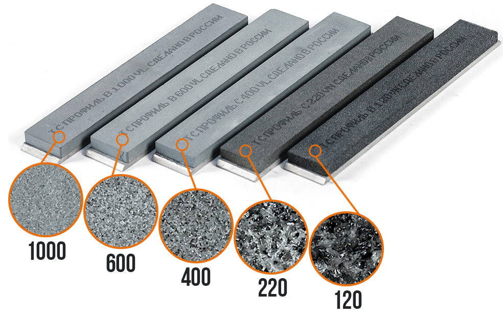 В наборе камней для заточки Профиль собраны абразивы различной зернистости: от 120 до 1000 грит. Такого набора будет достаточно для всех видов работ, от обдирки до финального шлифования.