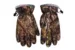 Пара перчаток с камуфляжным рисунком. Они имеют коричнево-зеленые оттенки, напоминающие лесной пейзаж. Верхняя часть перчаток отделана мехом, а на запястьях есть затяжки для регулировки.
