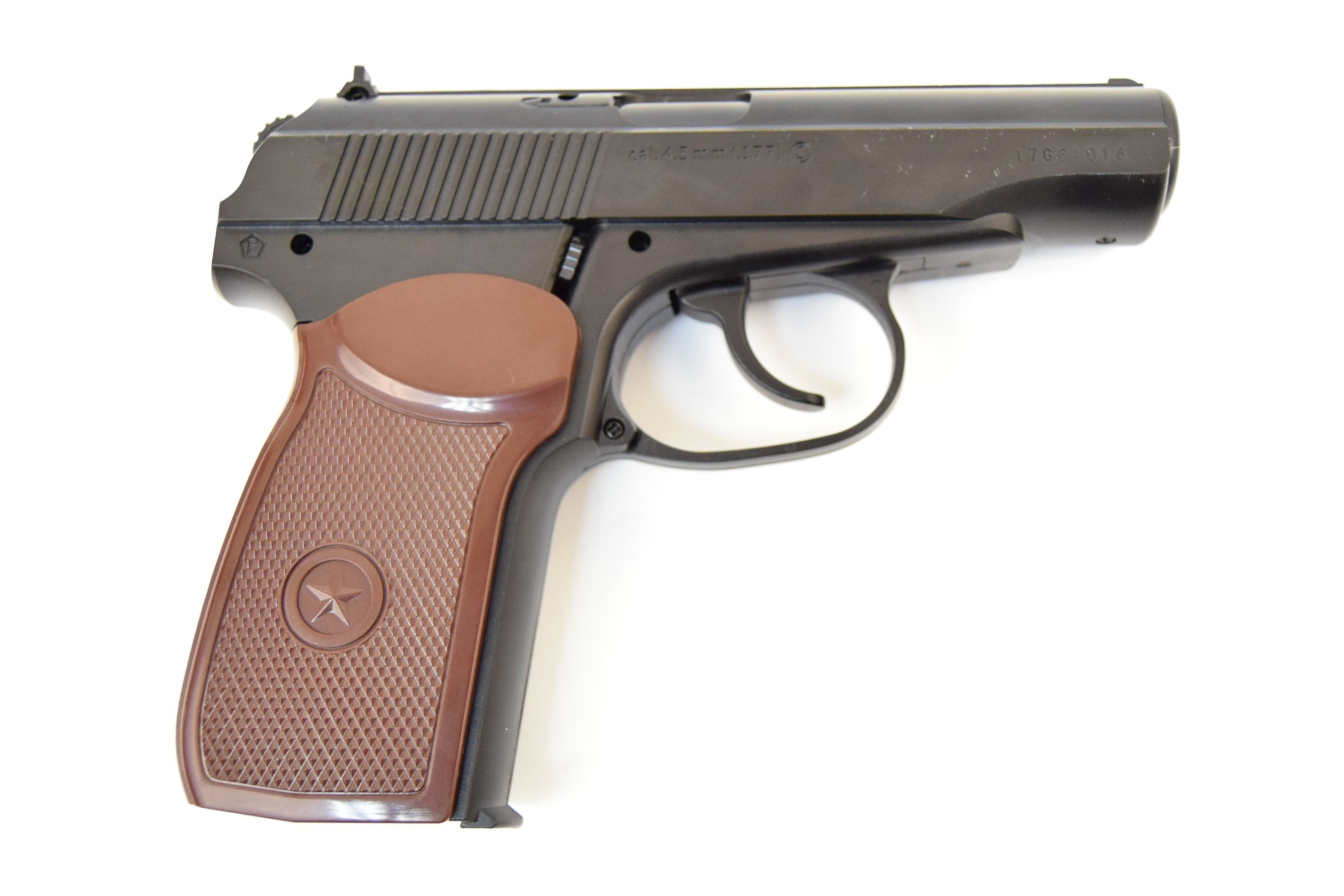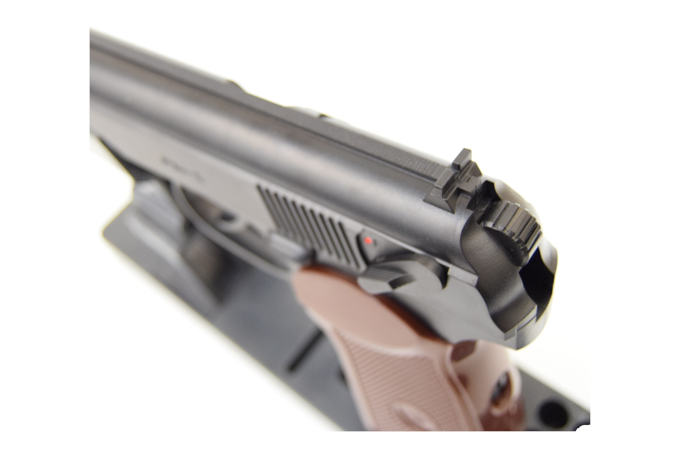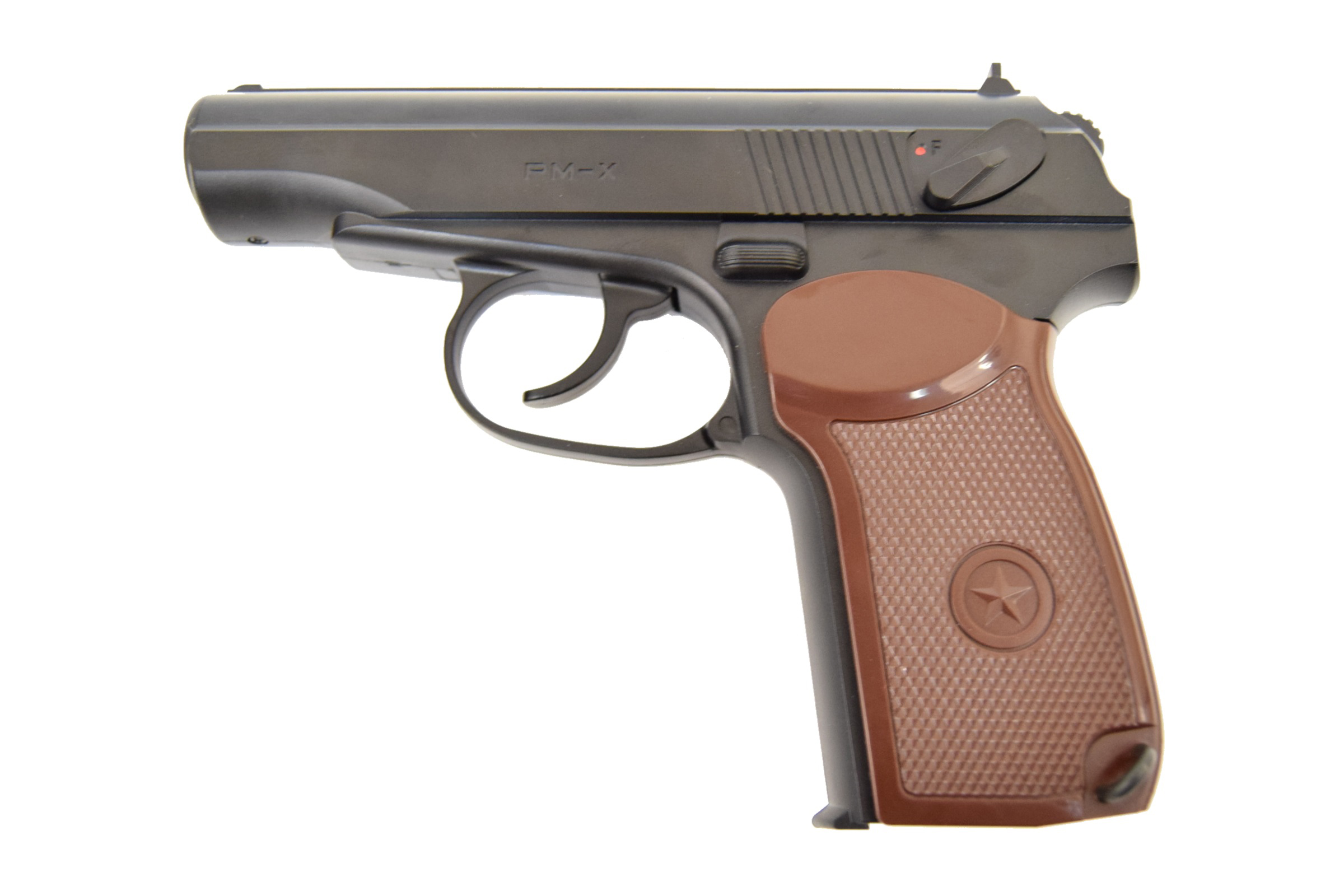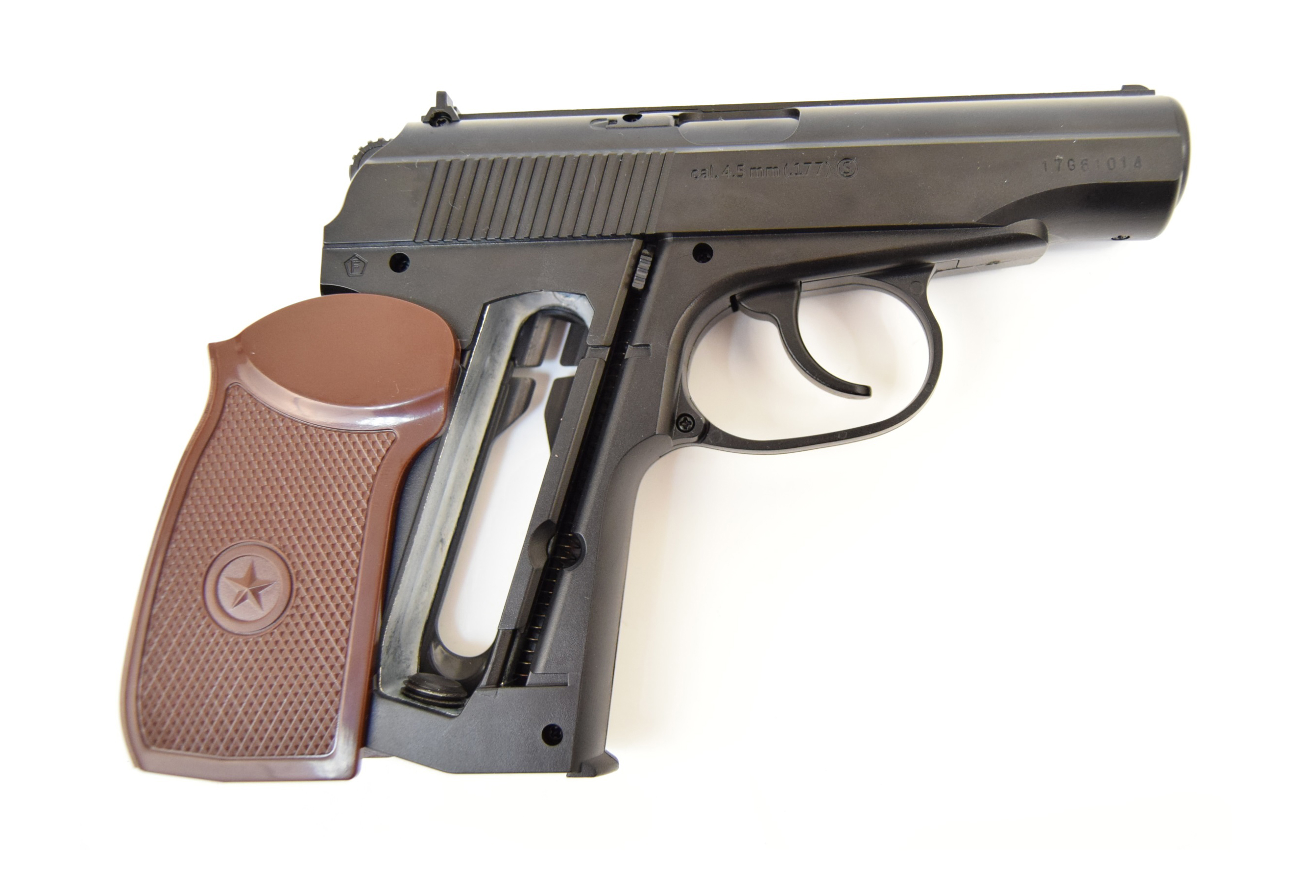 Дизайн: Внешний вид пистолета соответствует боевому прототипу Макарова в его классическом исполнении. Корпус окрашен в черный цвет, а на рукоятке есть пластиковая коричневая накладка с рифлением и пятиконечной звездой в центре