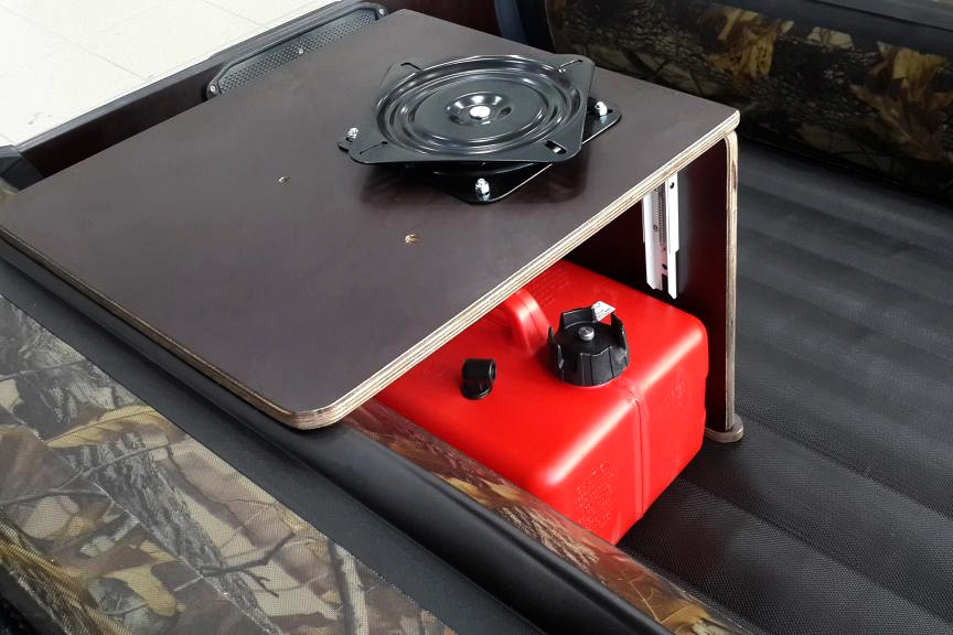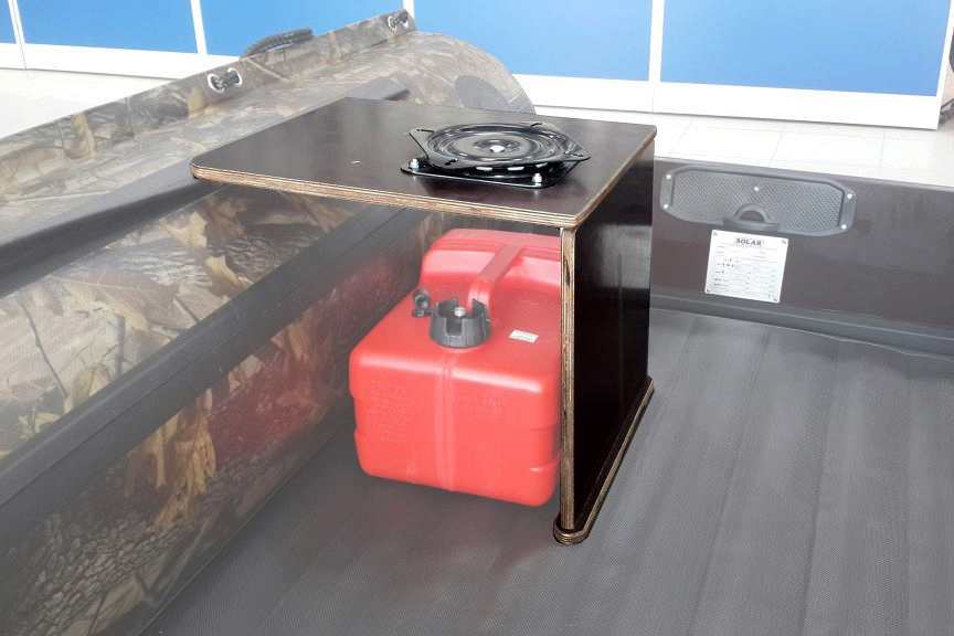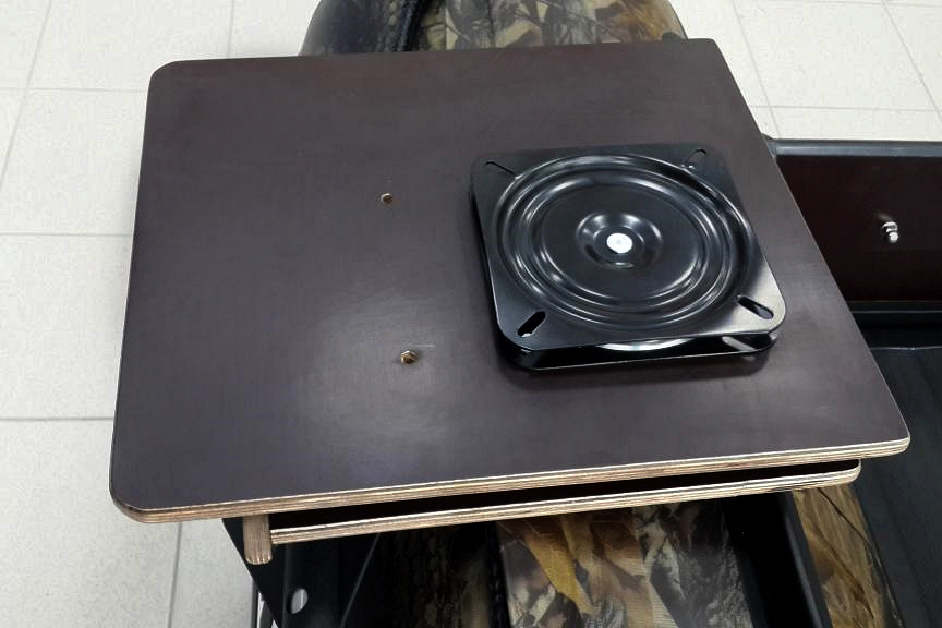 Платформа для установки кресла в лодку ПВХ изготовлена из ламинированной фанеры толщиной 15 мм. Стальные кронштейны фиксируются при открывании и исключают складывание конструкции в походных условиях в тоже время при нажатии позволяет сложить ПЛК в очень компактное состоянии для хранения.
