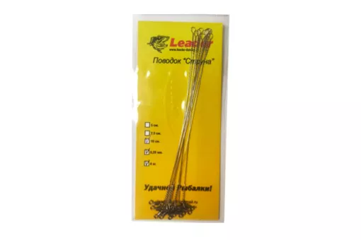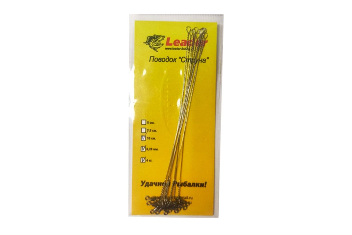 Поводок из металлической струны применяется при монтаже снастей для ловли щуки и других хищных видов рыб. Конструкция исключает перекусывание основной лески или шнура. Наличие вертлюга снижает вероятность запутывания оснастки при вываживании. Изделия поставляются в количестве десяти штук в одной пачке. Данный тип поводка подходит для использования как в открытой воде, так и в условиях подледного лова.