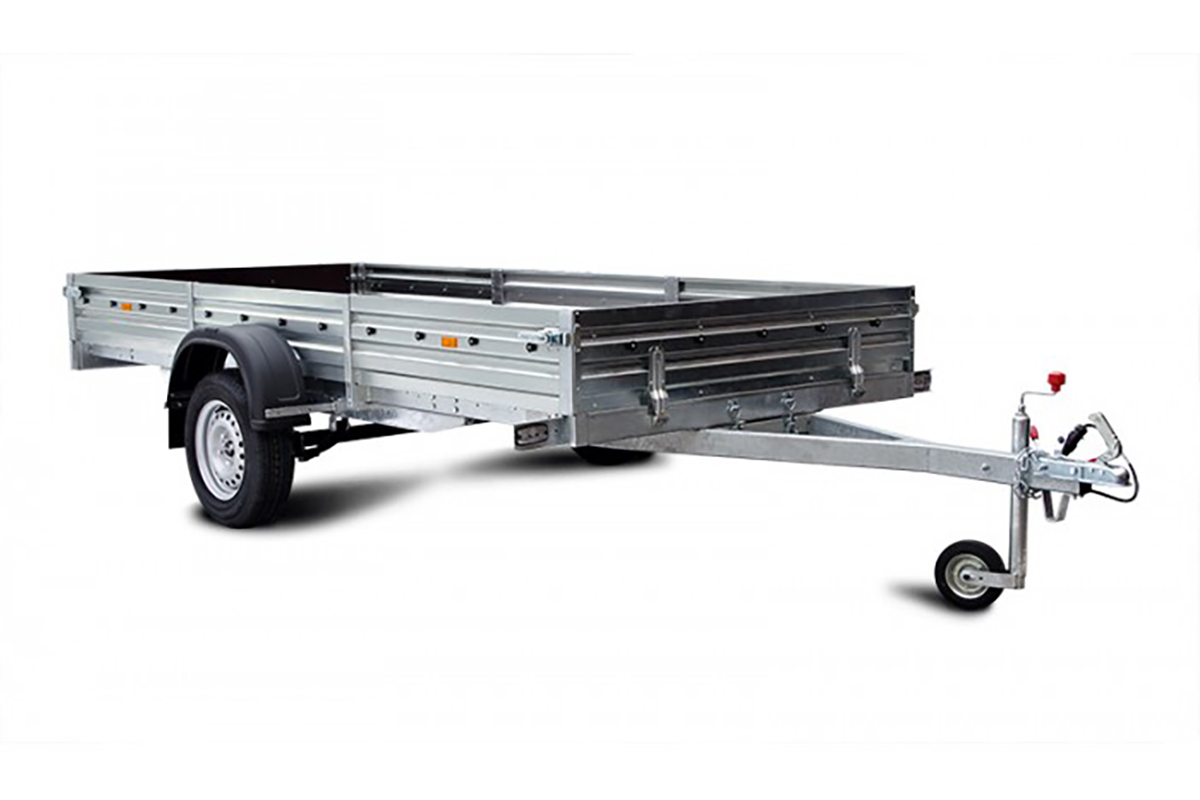 Прицеп для перевозки грузов. Конструкция включает металлическую раму и стальные борта. Кузов имеет деревянное дно. Подвеска рессорного типа. Установлена одна ось с двумя колесами. Для подключения к автомобилю используется штекер 7-pin.
