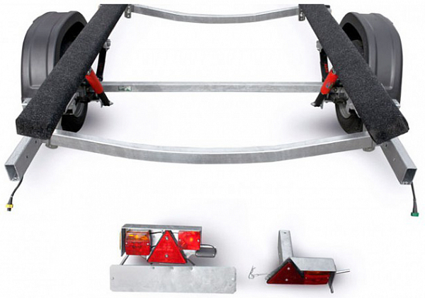 - Оцинкованная стальная рама выполнена из замкнутого профиля, имеет большой запас прочности и позволяет уберечь жгут электропроводки от внешних повреждений по все длине прицепа. Изогнутая конструкция поперечин рамы обеспечивает максимально низкую посадку судна, что снижает центр тяжести и повышает устойчивость прицепа во время движения.