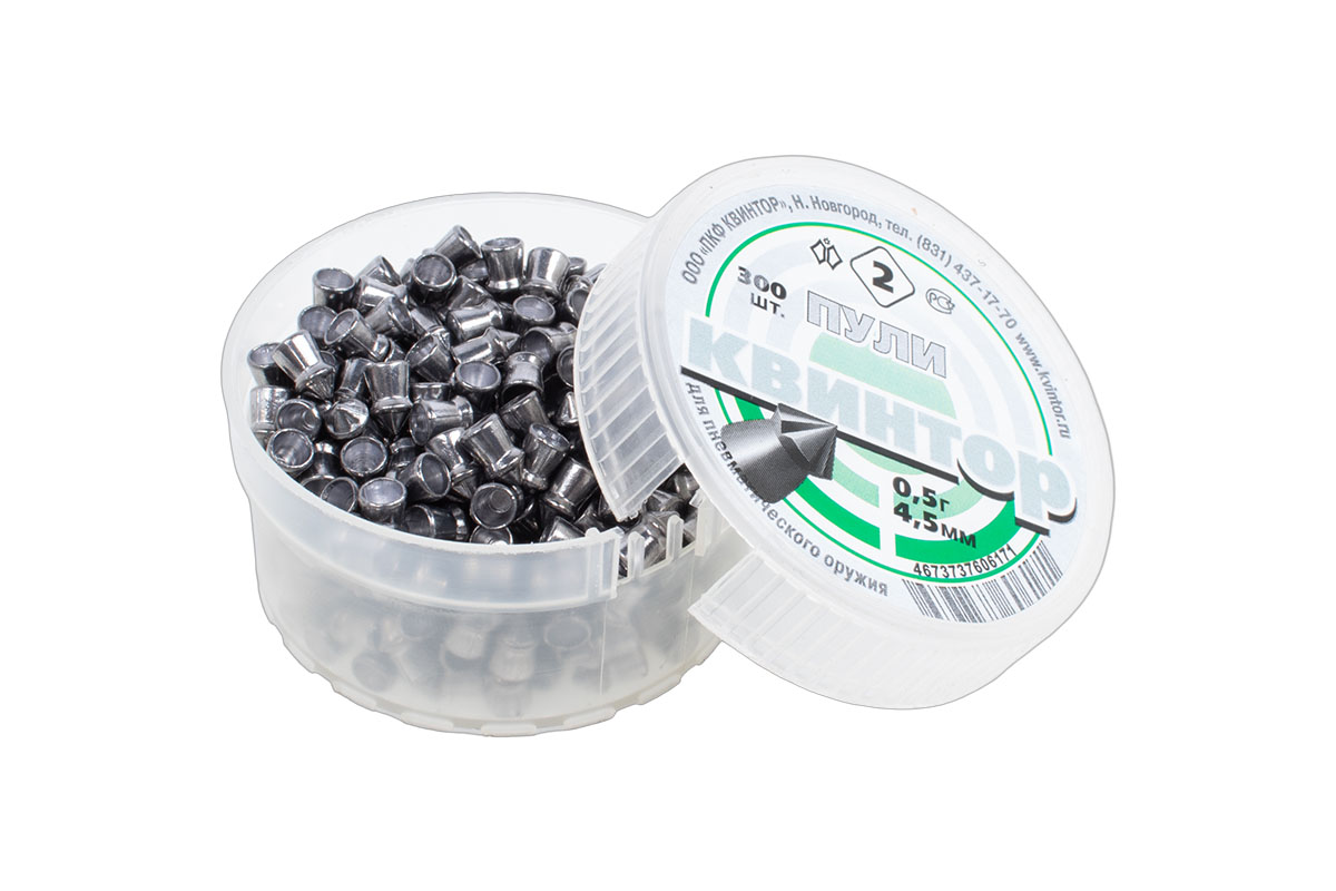 Остроконечные свинцовые пули «Квинтор» калибром 4,5 мм. Конструкция с острой головкой и насечкой обеспечивает максимальную проникающую способность. Масса одной пули составляет 0,53 г, длина — 7,4 мм. Предназначены для использования в пневматическом оружии. Производство осуществляется в России.