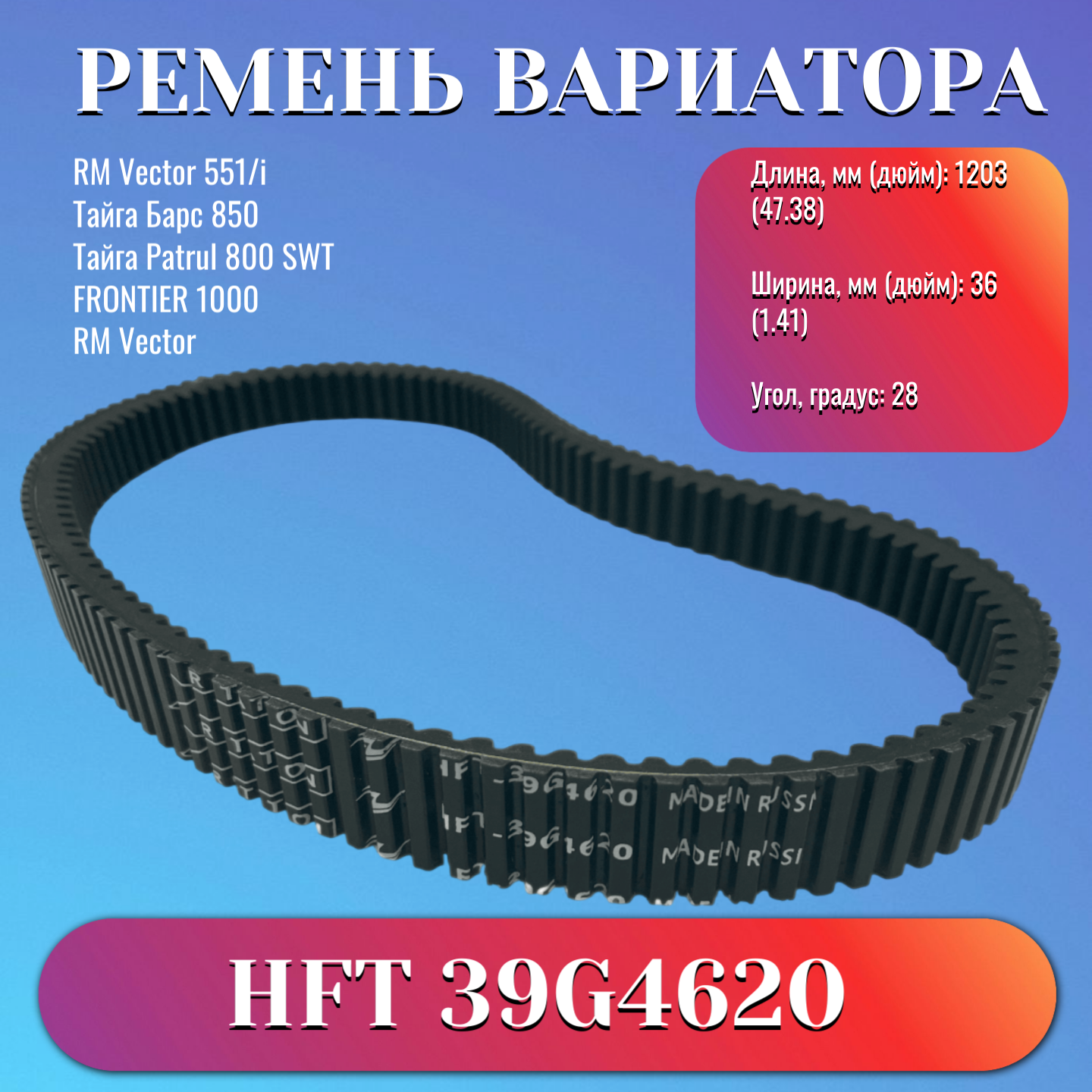 Ремень вариатора HFT 39G4620 РМ Vector, Patrul 800 обладает точными геометрическими параметрами, что обеспечивает его надежную работу и позволяет улучшить производительность транспортного средства. Благодаря своим характеристикам, он обеспечивает плавный и бесшумный переключатель скоростей, что позволяет водителю наслаждаться комфортной ездой.