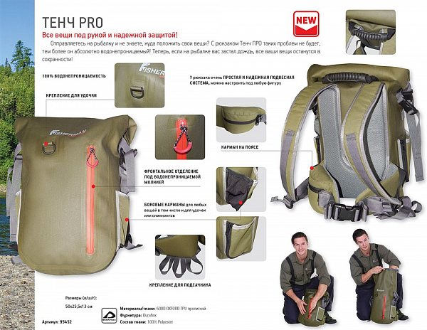 100% водонепроницаемость Фронтальное отделение под водонепроницаемой молнией Карман на поясе Боковые карманы для любых вещей в том числе и для удочек или спиннингов Крепление для подсачника Простая и надежная подвесная система, можно настроить под любую фигуру.