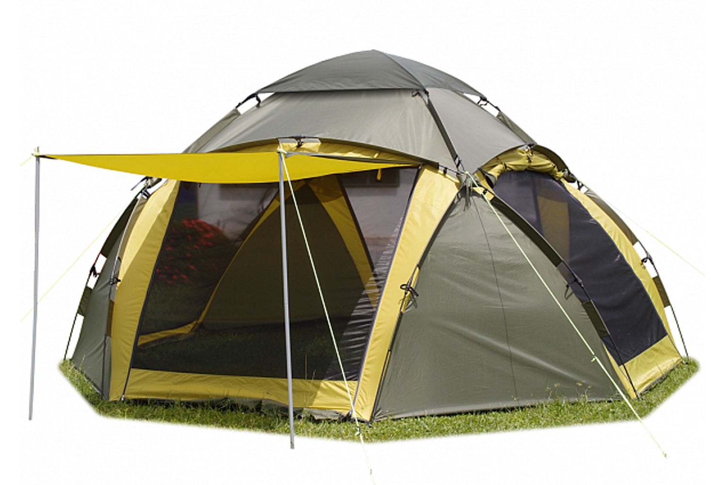 Чтобы в жаркую погоду в шатре было комфортно находиться, необходимо просто открыть все входы. Конфигурация пола шатра представляет собой восьмиугольник. Шатер имеет четыре больших входа-двери. Каждая из них закрывается противомоскитной сеткой и дублируется ветро/водозащитными стенками.