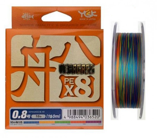 Суперновинка - восьмижильный шнур YGK Veragass PE x8 изготовлен из тех же волокон, что и классический Jig Man X8, но на новом технологическом уровне.Как и аналогичные модели-новинки от YGK (известнейшие Upgrade и Super Jigman), новый шнур заметно плотнее и тоньше своего прототипа.Производителю удалось повысить стойкость нити к резким рывкам - это улучшение невозможно переоценить, когда речь идет о всех современных спиннинговых техниках, подразумевающих ударные проводки (твичинг) либо силовые сверхдальние забросы джиговых приманок на максимально тонком шнуре.Как и прототип,новый шнур не растягивается, обладает высокой устойчивостью к истиранию, он круглый в сечении и очень скользкий.Окрашен в неяркие но весьма контрастные цвета (пятицветная схема со сменой окраски через каждые 10м), окраска очень устойчива.