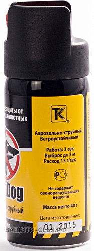 Высокоэффективное средство от собак - аэрозольный баллончик Антидог, разработан специально для защиты от бродячих собак. Бродячие собаки уже несколько лет стали представлять серьезную опасность в больших городах. По новому гуманному законодательству бродячих собакбольше не отстреливают - их даже если поймают - стерлизуют и отпускают бегать обратно. Это привело к очень плачевным последствиям. Только в Москве ежегодно за помощью от укусов собак обращаются порядка 35 000 человек!!! В стаи бродячих собак попадают и дикие волки из ближайших пригородных лесов - собаки от знакомства с ними становятся только опаснее. Газовый баллончик Антидог это высоко эффективное средство против собак, которое при этом отвечает всем самым гуманным требованиям и не убивает и не калечит животное. Рассуждения о гуманизме мы оставим гуманистам. Подавляющему большинству людей свое здоровье и жизнь дороже чем собачье чуткое обоняние - да и его баллончик Антидог не выводит из строя надолго. При этом Антидог является индивидуальным средством защиты от собак которое может позволить Вам или Вашему ребенку отразить нападение животных и остаться не искусанным. Газовый баллончик Антидог не является оружием и не предназначен для использования по человеку, за исключением случаем предусмотренных ст. 37 УК РФ- Масса жидкого состава (в среднем): 40 г.