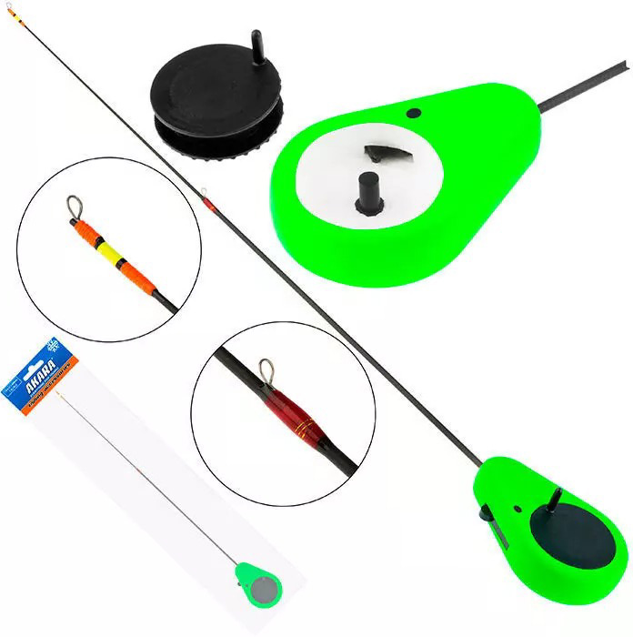 Зимняя удочка Helios Akara SK-1C-G для блеснения с жестким моно хлыстом Hi Carbon. Удобная рукоятка с пластиковой шпулей и рычагом для быстрого сброса лески при неожиданной поклевке.
