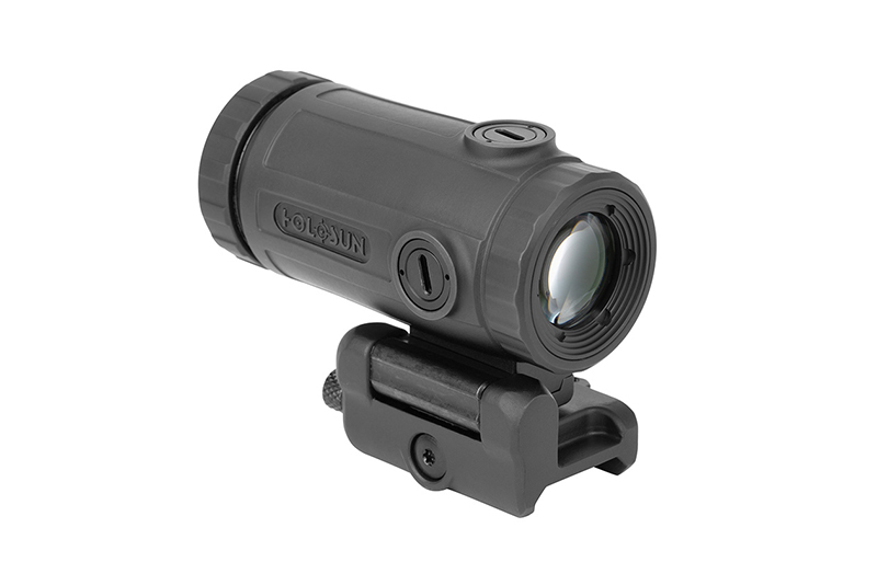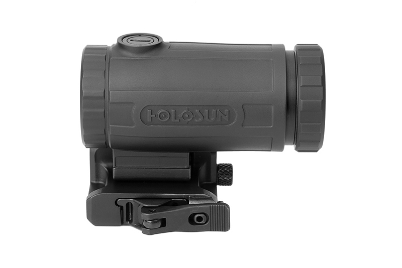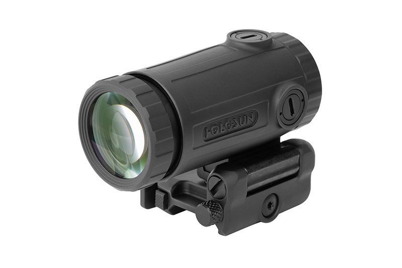 Увеличитель Holosun имеет быстросъёмный кронштейн для установки на базу Weaver/Piсatinny совместно с коллиматорным прицелом или используется самостоятельно в качестве монокуляра. Имеет регулировки по горизонтали и вертикали для более точного согласования с прицелом. На окуляре имеется диоптрийная настройка ±3. Корпус увеличителя выполнен из титана, герметичен и заполнен азотом.