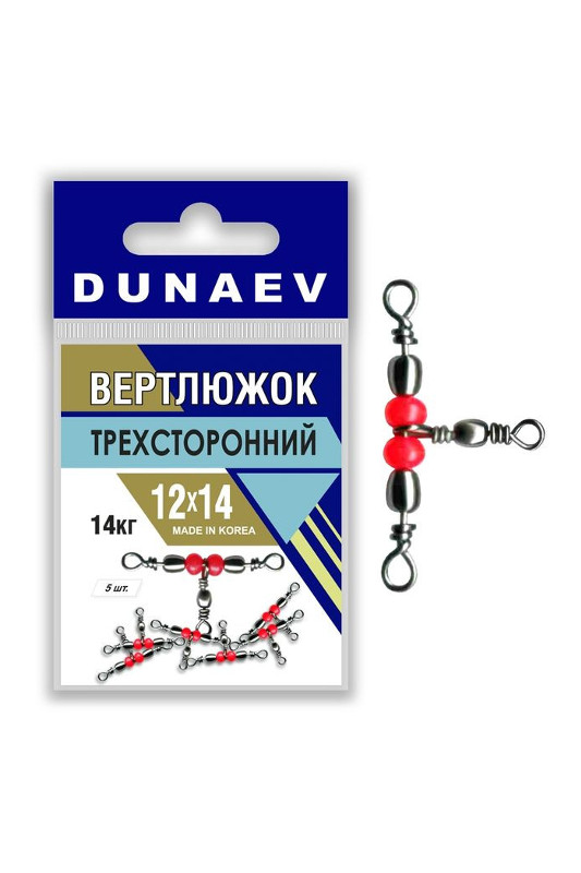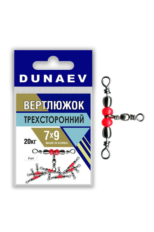 Трехсторонние вертлюги Dunaev используются для монтажей с отводным поводком. Снижают риск перекручивания элементов оснастки, запутывания лески. В случае обрыва поводка обеспечивают его более простую и быструю замену. Укрупненные крепежные ушки облегчают монтаж. Между бочонками расположены две яркие бусины. Производится линейка для бренда Дунаев на заводе в Корее, что говорит о тщательном контроле качества. Для изготовления используется крепкая сталь. Разрывная нагрузка в зависимости от модели может достигать 22 кг.