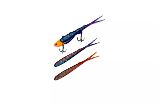 Особенности гибридной приманки. Приманка представляет собой двухсоставную конструкцию. Корпус изготовлен из пластика, хвостовая часть выполнена из силикона. Предусмотрена возможность замены хвостового элемента. Материалы обладают свойством свечения в ультрафиолетовом спектре. В конструкции используются кованые крючки.