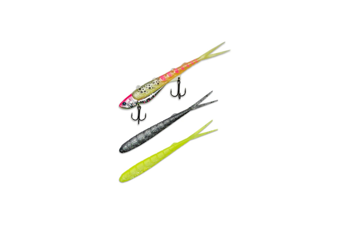 Краткое описание виброхвоста для отвесного блеснения. Данный продукт представляет собой гибридную приманку для отвесной ловли. Конструкция состоит из жесткого тела и съемного силиконового элемента. Модель относится к тонущему типу. Вес изделия составляет 33 грамма при длине 16.5 сантиметров. Приманка позиционируется для ловли хищных видов рыб.