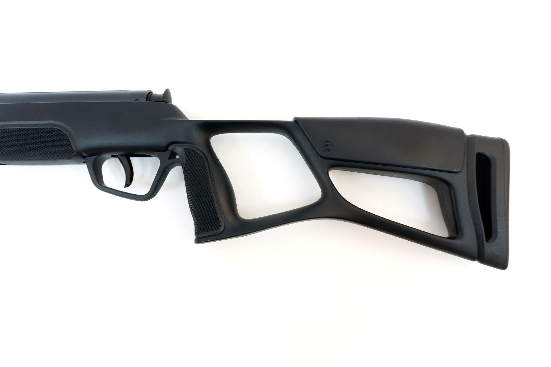 Приклад винтовки Stoeger X3-Tac Synthetic имеет необычную конфигурацию, с ребрами жесткости, придающими оружию дополнительную прочность.