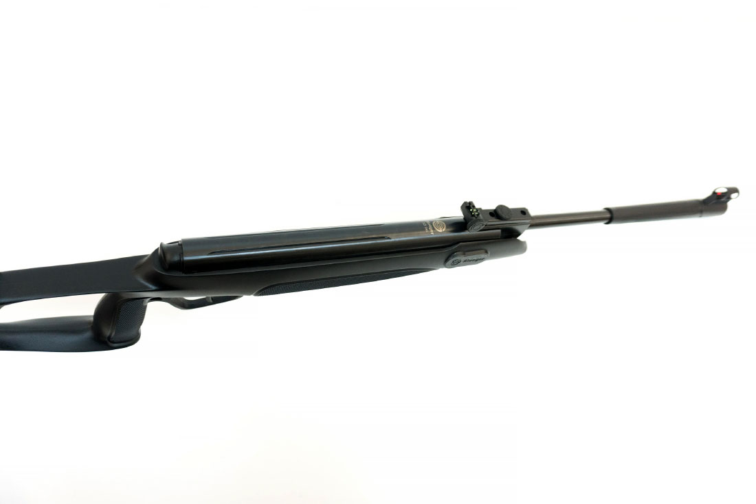 Для стрельбы здесь требуются стандартные пули 4,5 мм. Они приобретают при вылете из ствола скорость в 140 м/с. Это показатель может быть увеличен почти в 2 раза при замене штатной пружины на усиленную – запас прочности винтовки позволяет это сделать. Установлен автоматический предохранитель для повышения безопасности стрелка. Ствол винтовки нарезной, нарезы стабилизируют пулю в полете и повышают результативность выстрела.