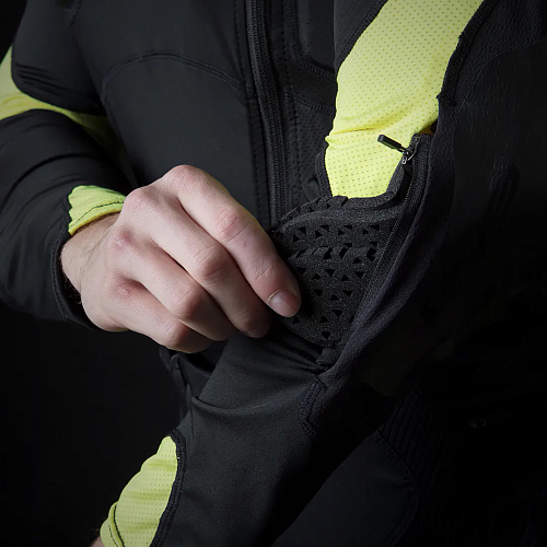 - Оснащена RMF защитой груди, плеч, спины и локтей, которая поглощает ударную энергию и распределяет ее по всей поверхности. Вы не будете чувствовать боль или давление в этих зонах, а также сможете снимать или прикреплять панели защиты в зависимости от ваших предпочтений и условий езды.