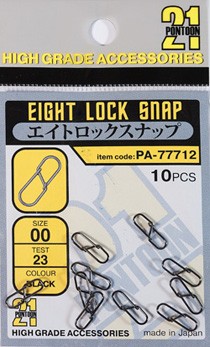Как и верлюжки, застежки являются наиболее востребованными элементами рыболовных приспособлений. На рыбалке они не только обеспечивают простоту и легкость замены одной приманки на другую, но и экономят само время, которого в процессе поиска и ловли рыбы всегда не хватает. Застежки от Pontoon 21 Eight Lock Snap выполнены из высококачественной стальной проволоки. Они двусторонние, наделены оригинальной формой в виде восьмерки, которая при нарастающей нагрузке способна даже чуть усилить конструкцию за счет самозатягивания. Предлагаются в трех размерах с разрывной нагрузкой от 23 до 44 кг.
