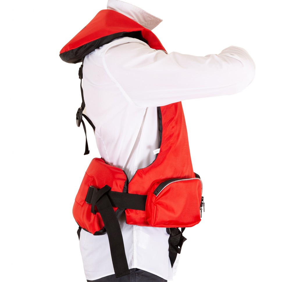 Благодаря увеличенным вставкам плавучесть 50N осталась на уровне рыболовного жилета. Эта новая модель имеет регулировки поясного и спинного ремней. Съемный брасовый ремень находится в специальном кармане на спинке. Для самого необходимого есть два объемных кармана на молнии. В одном из них находится комплектный свисток.